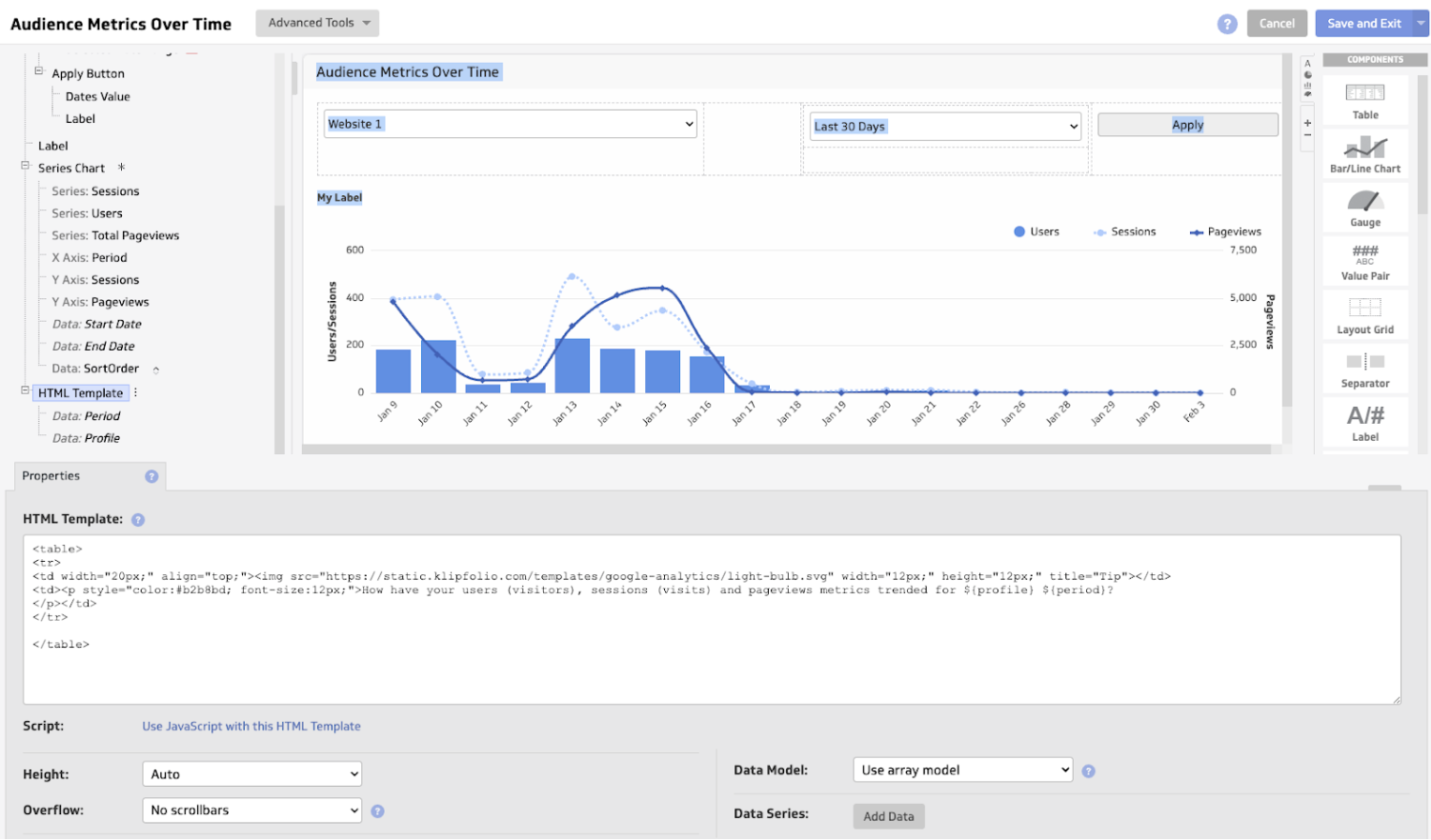 - Components - Choose between components like table, chart, gauge, value pair, layout grid, and image.