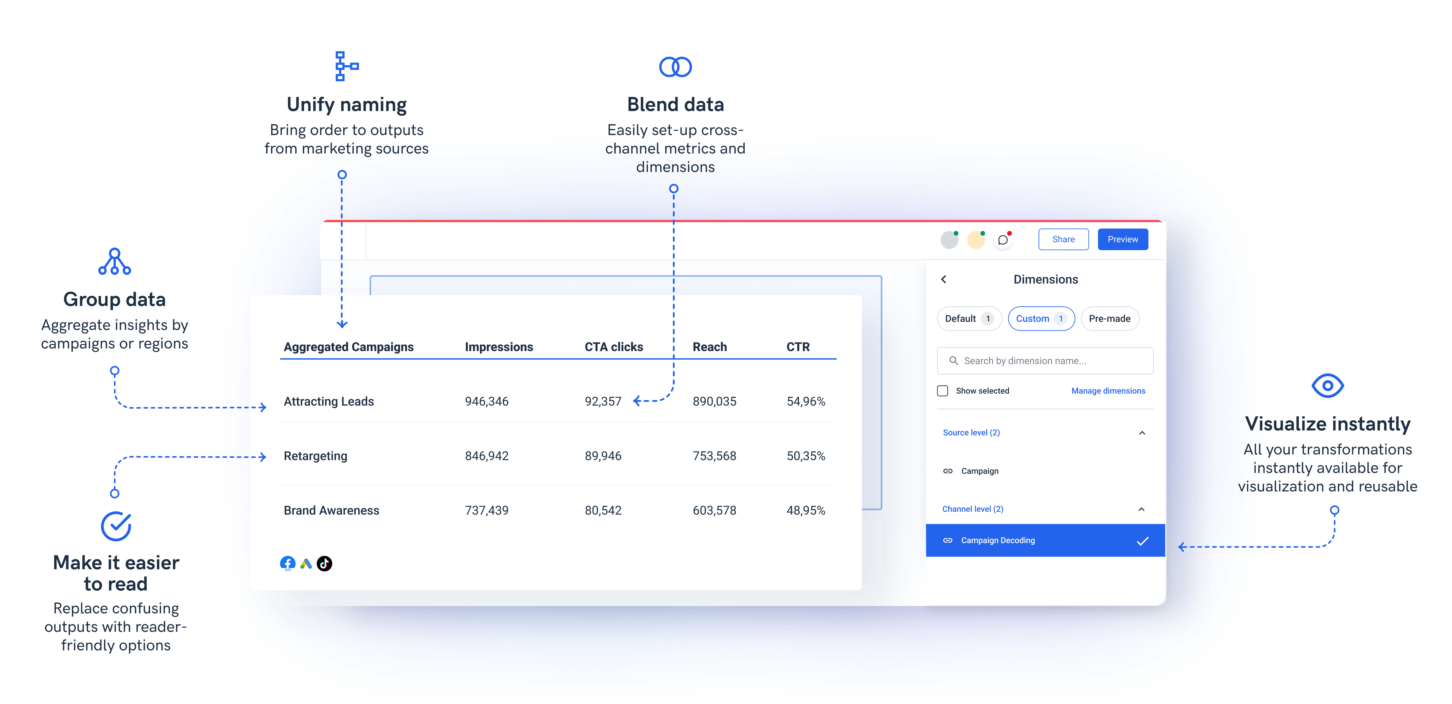 Here's an example: When visualized, your internal campaign naming is confusing and makes it hard to see what's happening. By organizing data in Whatagraph, you go from scattered campaign metrics to clearly displayed insights to analyze or share.