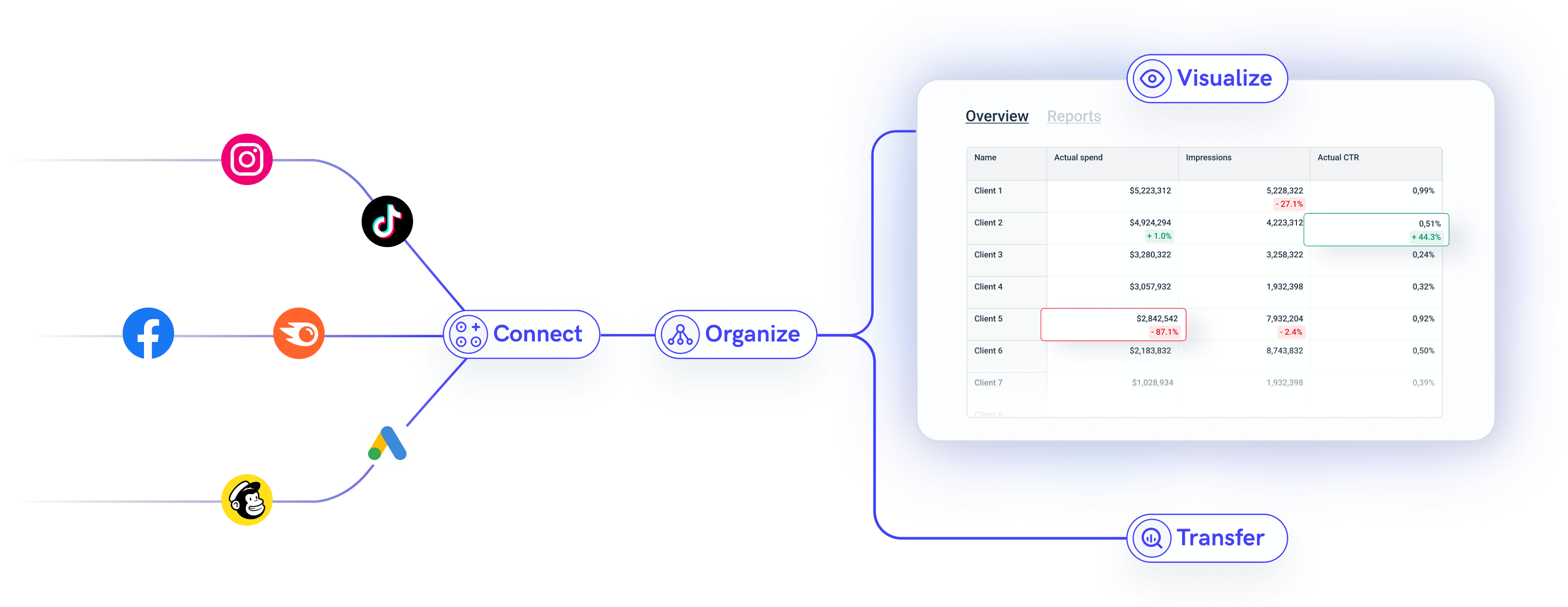 No more manually collecting data in spreadsheets. Bring all your data onto Whatagraph in minutes.