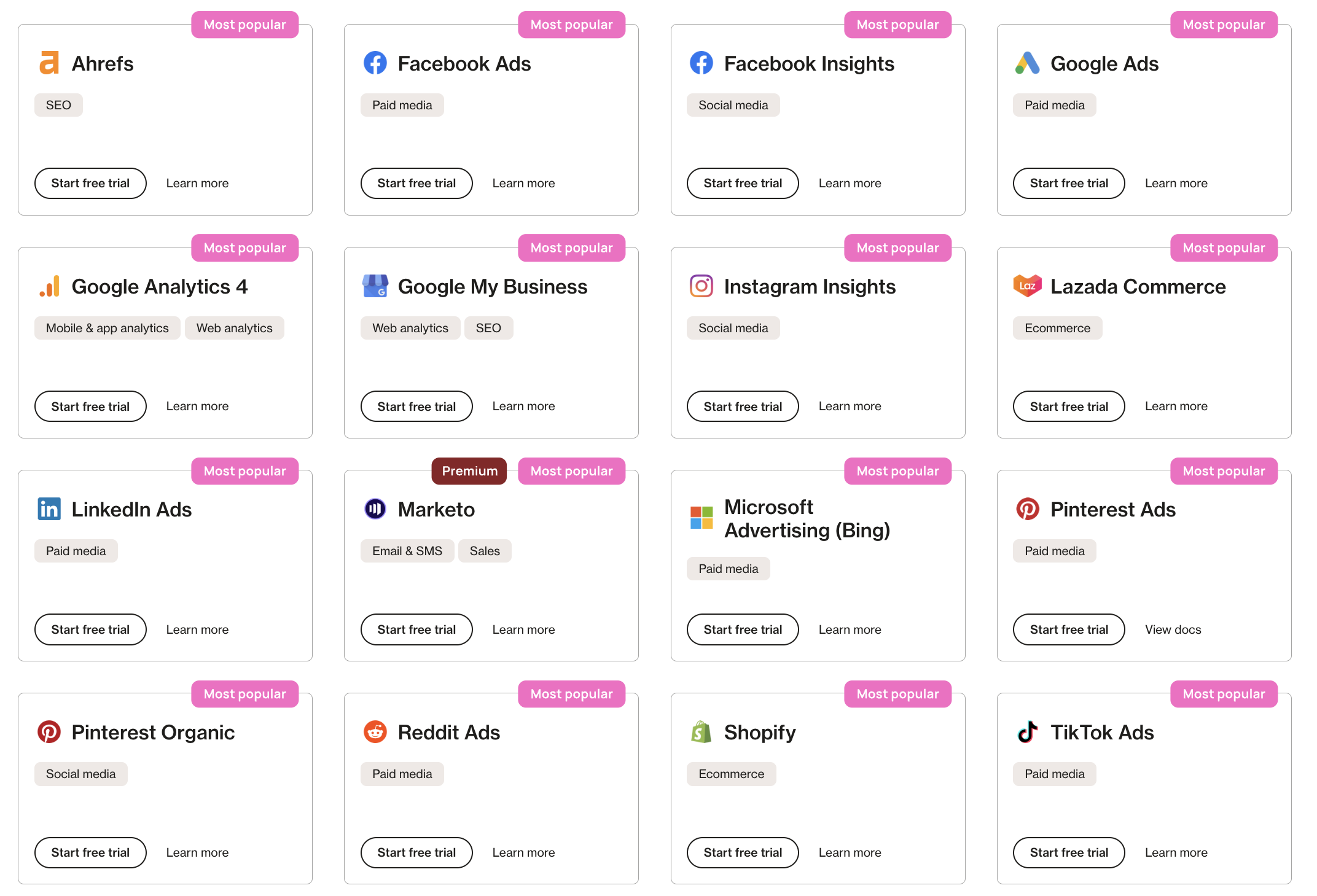 - 130+ marketing and sales data sources: From Google Analytics and Facebook Ads to HubSpot, LinkedIn, TikTok Ads, and more.